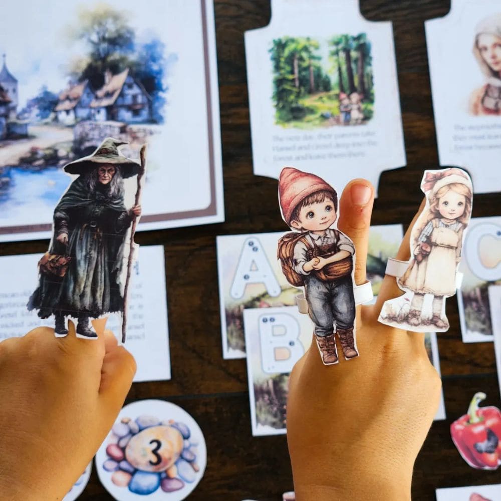 Finger Puppets and Background Images: Encourage creative play and storytelling with Hansel, Gretel, and the witch finger puppets, along with enchanting background images. Kids can recreate scenes from the story, fostering their imagination and narrative skills.
