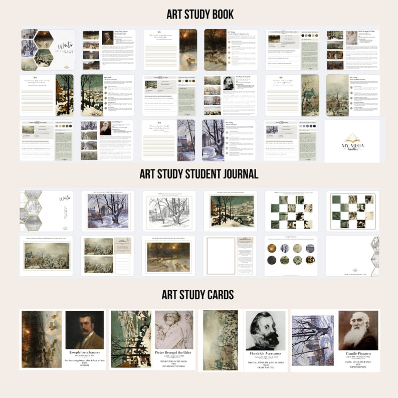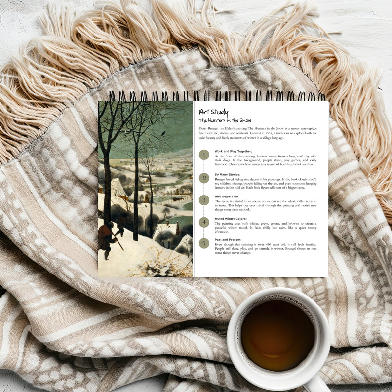 Celebrate the beauty of winter through the eyes of the great masters with this Winter Art Study—a 4-week printable fine art appreciation curriculum designed for homeschool families and co-ops. Ideal for ages 8–14, this set blends timeless paintings, artist biographies, and Charlotte Mason-inspired prompts with journaling, copywork, and creative activities.